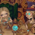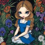 Alice and the Frogman debuted as part of the “Alice Enchanted” show at Pop Gallery several years ago. This painting was originally in a very unique four-paneled frame with four different openings showing the Frog Footman, Alice, the Queen’s Letter, and the Queen of Hearts’ crown.