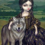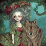 Loup-Garou: d’Automne is from the Loup-Garou series meaning werewolf in French, featuring wolves in historically French Rococo settings. This Rococo beauty in a gorgeous dress & hat is wandering through an autumn background with her wolf companions. The autumn leaves are flamingly bright.